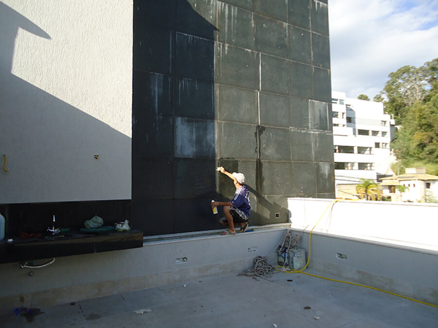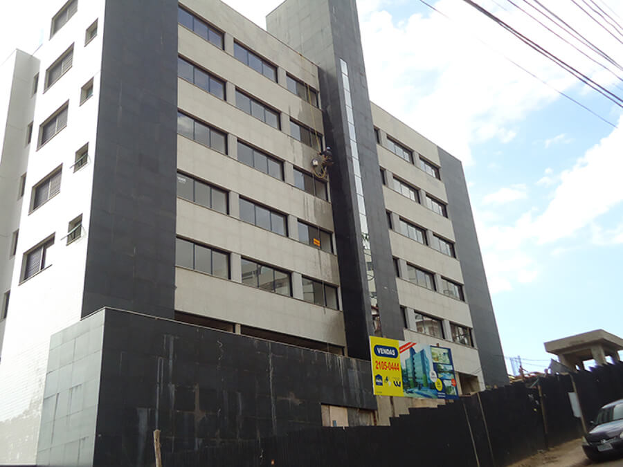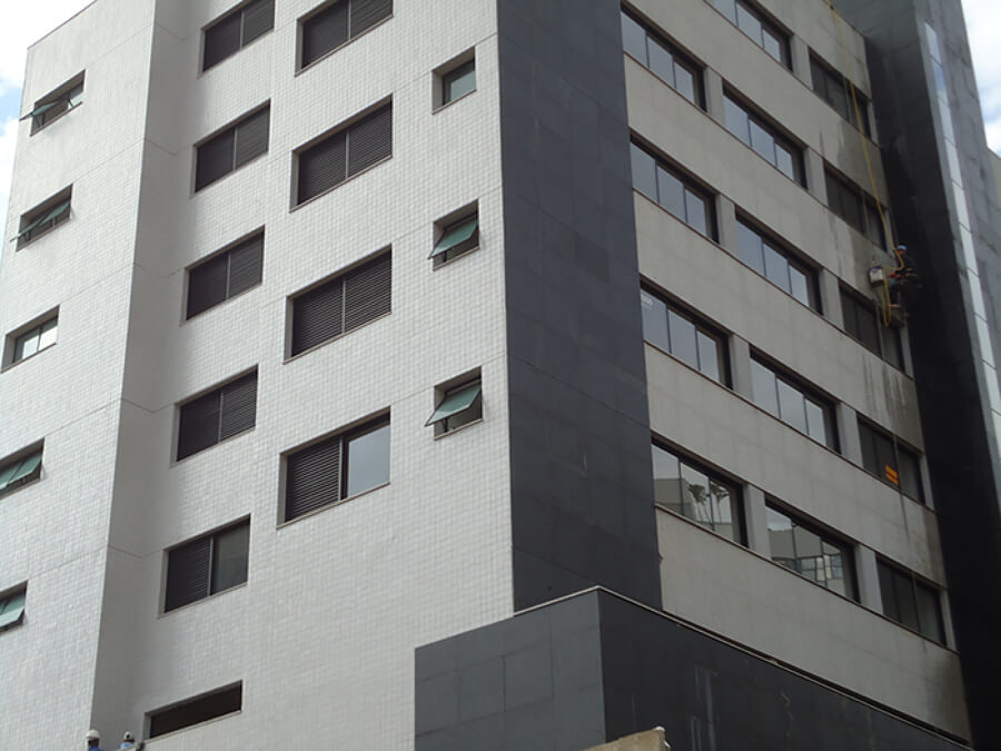 Serviço de lavagem de fachada de prédio com sabão pastoso e ácido muriático para limpeza das cerâmicas.